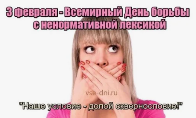 3 февраля отмечается Всемирный день борьбы с ненормативной лексикой. Для большинства людей название это однозначно и правильно воспринимается как Всемирный день борьбы с нецензурной бранью.